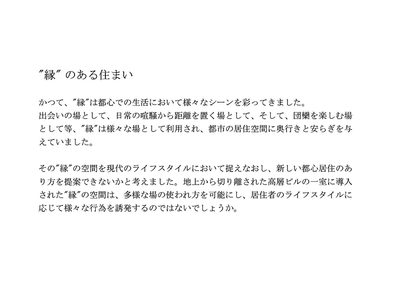 東京都港区虎ノ門に建設中の地上30階建てタワー型分譲マンション、その28階の約80㎡の1ユニットが対象となっている。建設予定地は、近代的なオフィス街と下町的な景観とが混在している地区に位置しており、古きものと新しきものが混在する場所にある。この計画ではその立地条件を考慮し、かつて都心の居住空間に奥行きと安らぎを与えていた"縁"(側)のような空間に着目した。"縁"の空間を現代のライフスタイルに応じて捉えなおし、新しい都心居住のあり方を提案した。